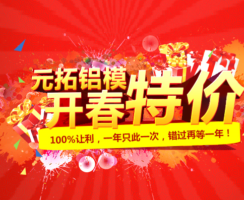 誰說鋁合金模板太貴?誰說沒有優(yōu)惠?羊年元拓鋁模最惠活動來襲,2015年3月2日-2015年3月31日期間元拓集團為回饋新老客戶特推出【鋁模?大酬賓活動】,鋁模產(chǎn)品百分百讓利,一年只此一次,錯過再等一年!